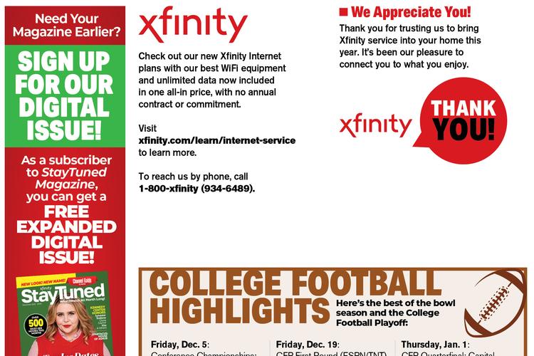 There are over 3,000 movies that air on cable/satellite TV alone each month, and StayTuned makes it easy to find a good one. Never has there been such a robust, comprehensive guide to movies and TV. This 200-plus page TV guide details the best of what’s new, what’s returning and what to watch on TV every month. And each issue is customized uniquely to the customer and their cable, satellite or internet provider providing an updated channel lineup each month.